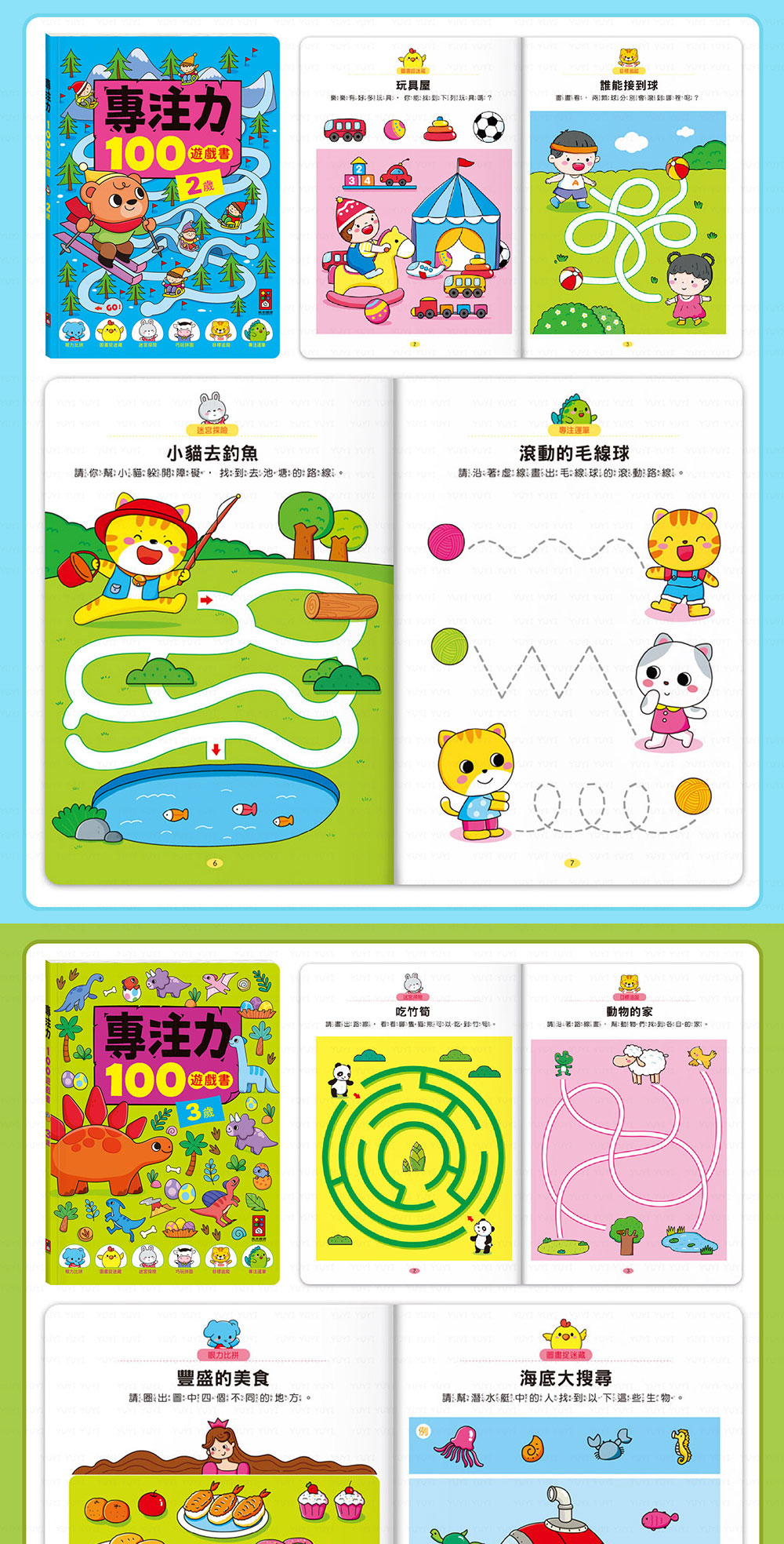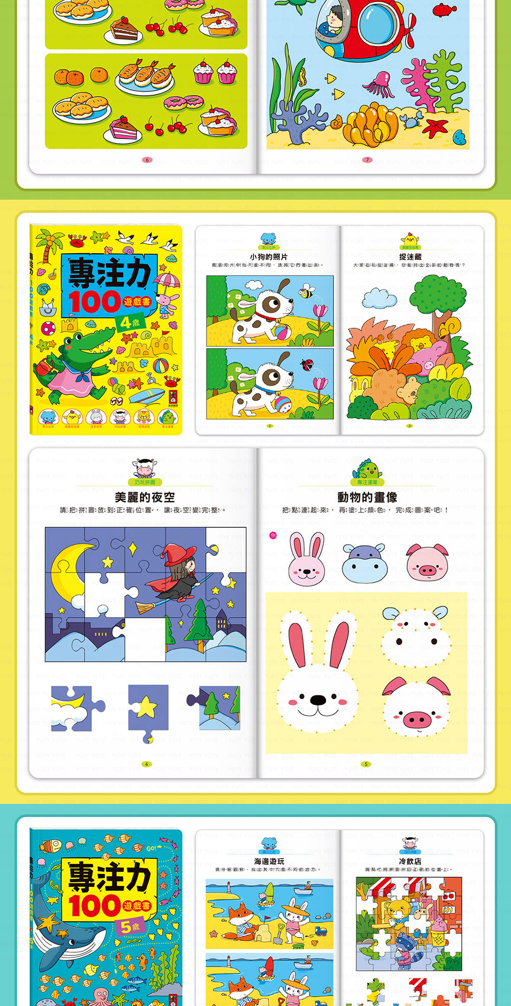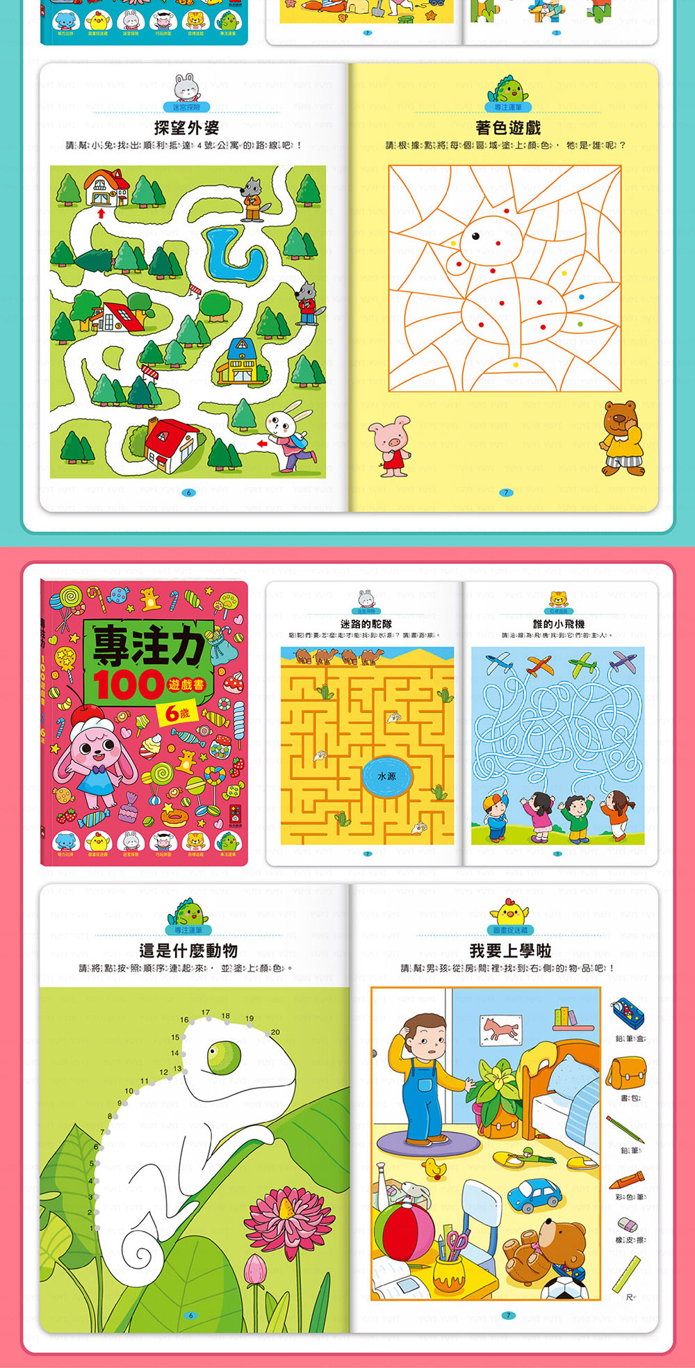 《專注力100遊戲書》有五大不同主題分別強化孩子邏輯、思考、觀察、運筆等多種能力,包含找一找、走迷宮、連線、運筆練習、拼圖等多種遊戲,並將其分門別類,幫助孩子提升專注力,全面強化邏輯思維。