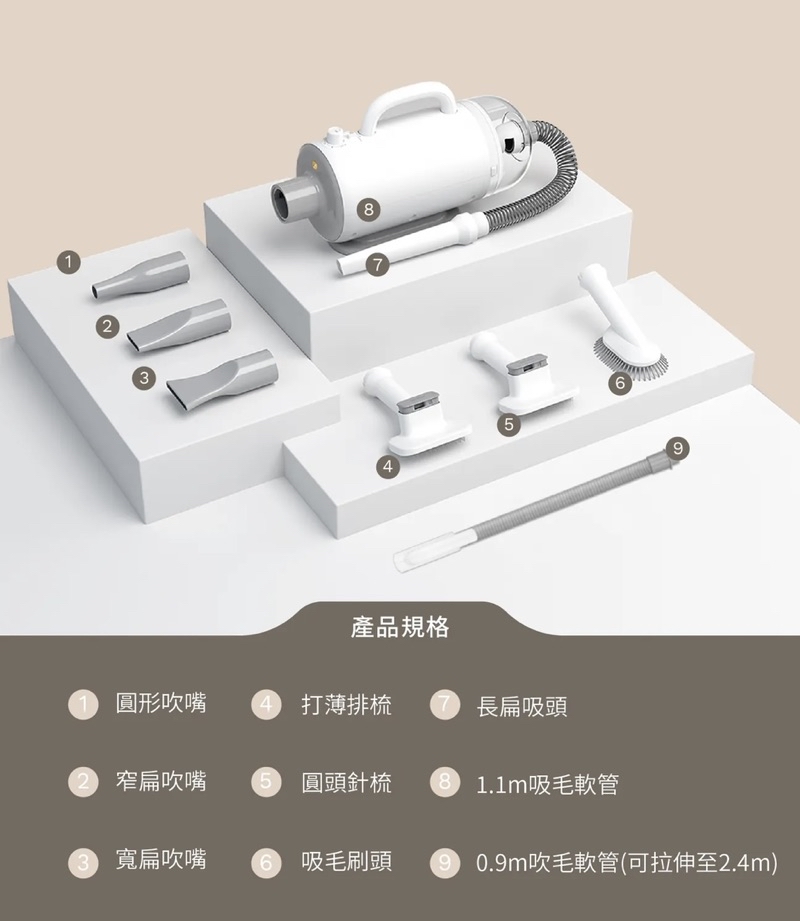 🏷 產品配件:機體*1、說明書*1、吸嘴*3、吸嘴*4、吸毛軟管*1、吹毛軟管*1、儲毛杯