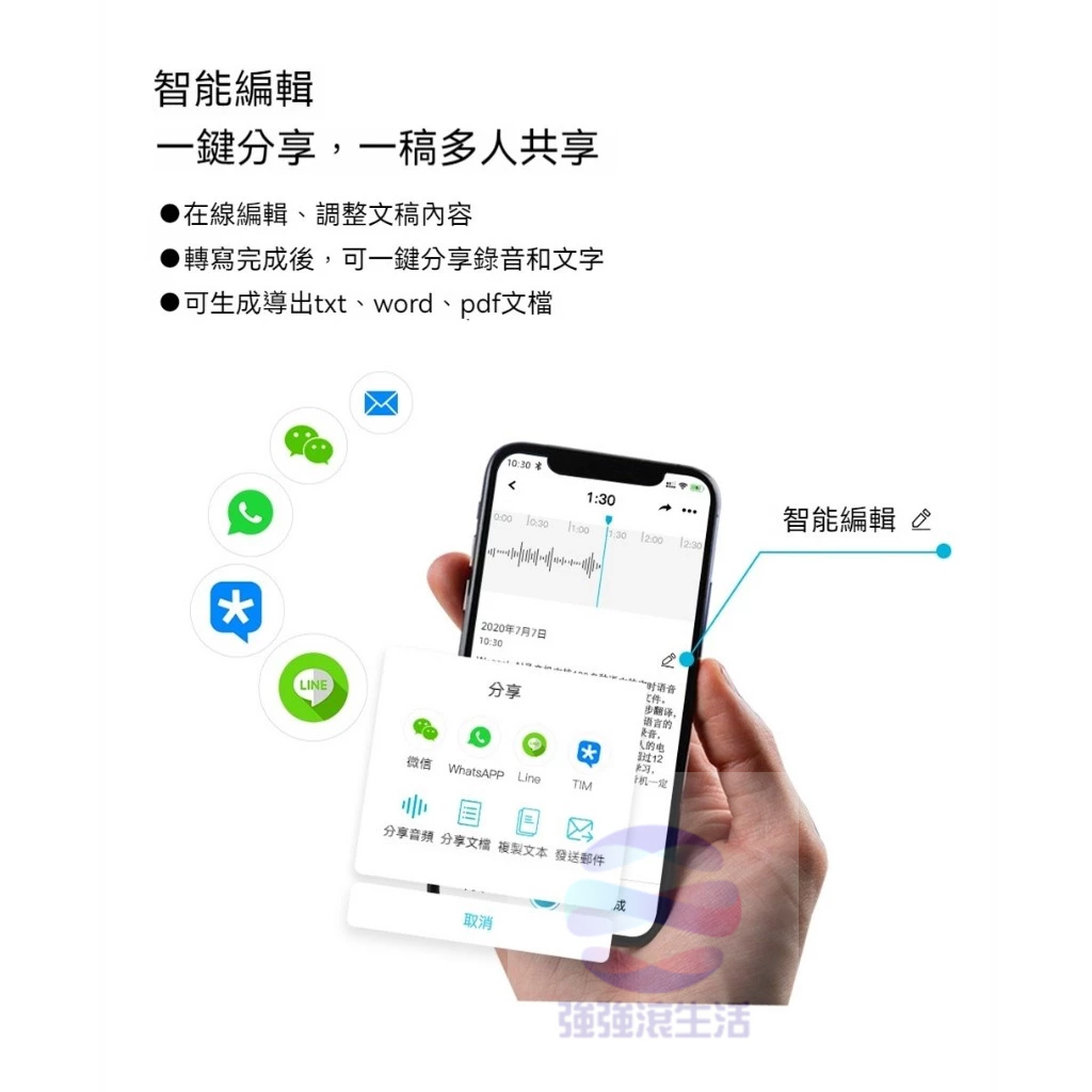 錄製完成後,從 APP 內預覽逐字稿,以及翻譯後的外語文字檔,用字需要微調可以利用手機即時編輯,還支援 wav / Word / TXT 輸出格式,能馬上分享到通訊軟體。