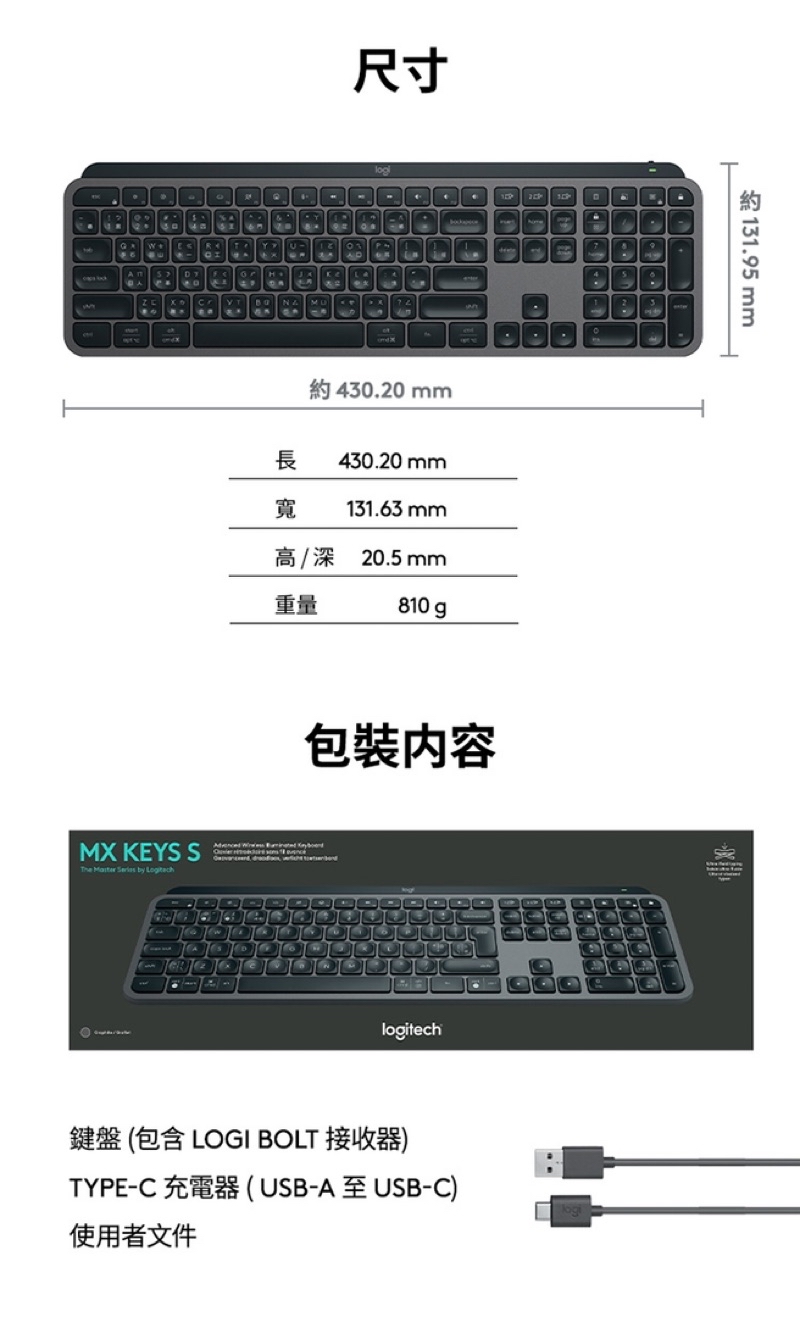 透過藍牙低耗電技術或 Logi Bolt USB 接收器 (僅 MX Keys S 隨附) 連線 (此鍵盤與其他羅技 USB 接收器不相容)