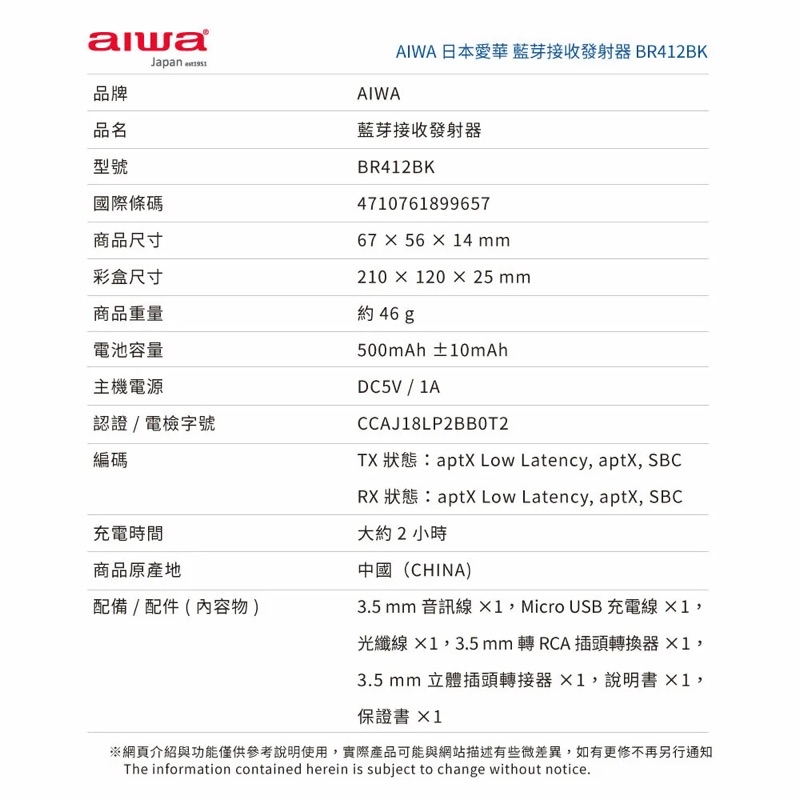 AIWA 日本愛華 藍牙接收發射器 BR412BK
