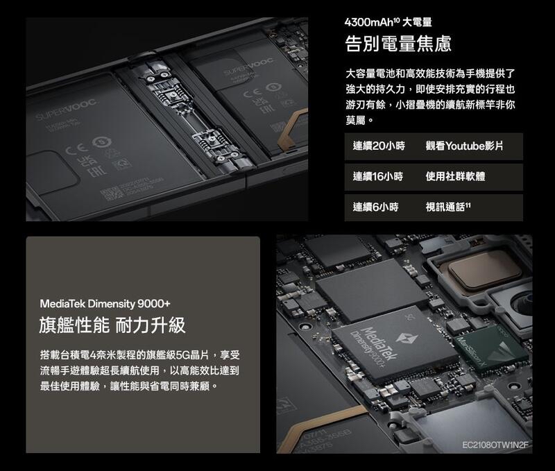 OPPO Find N2 Flip 運行 Android 13 作業系統、ColorOS 13 操作介面,搭載聯發科天璣 9000+ 八核心處理器,內建 8GB RAM + 256GB ROM;支援 5G + 5G 雙卡雙待,提供 Wi-Fi 6、藍牙 5.3、NFC 功能;電量方面,配備 4,300mAh 雙電池架構,支援 44W SuperVOOC 超級閃充。