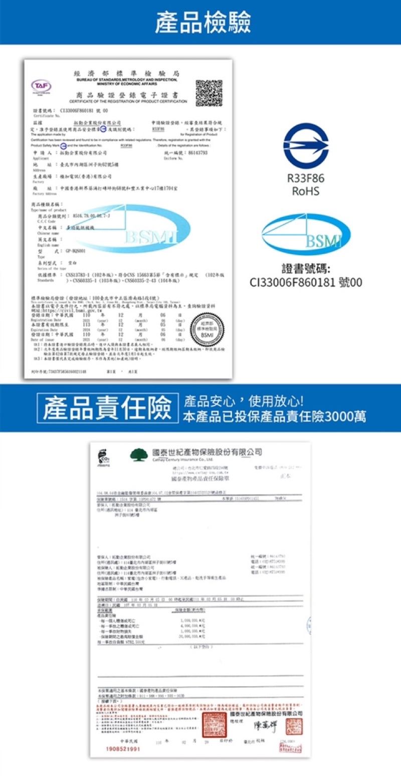 國泰產險 產品責任險保險號碼: 1516字第12PD01449號