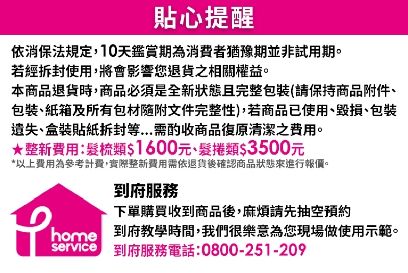 整新費用:髮梳類:1600元/髮捲類:3500元,以上費用為參考計費, 實際整新費用需依退貨後確認商品狀態來進行報價