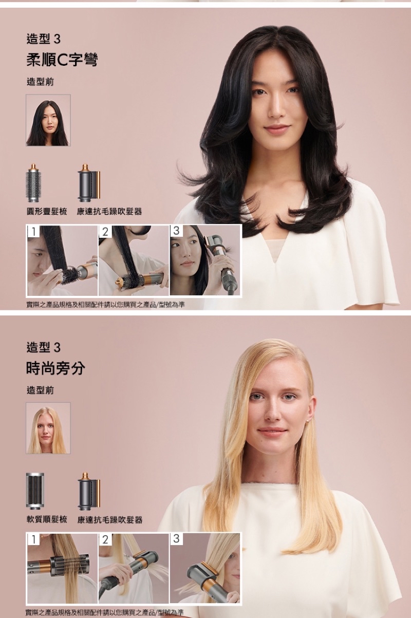 Dyson Airwrap™多功能造型器結合強大的數位馬達與空氣力學,利用康達效應的空氣力學現象,為頭髮造型出捲髮、順髮效果-過程中皆無須使用過熱高溫。