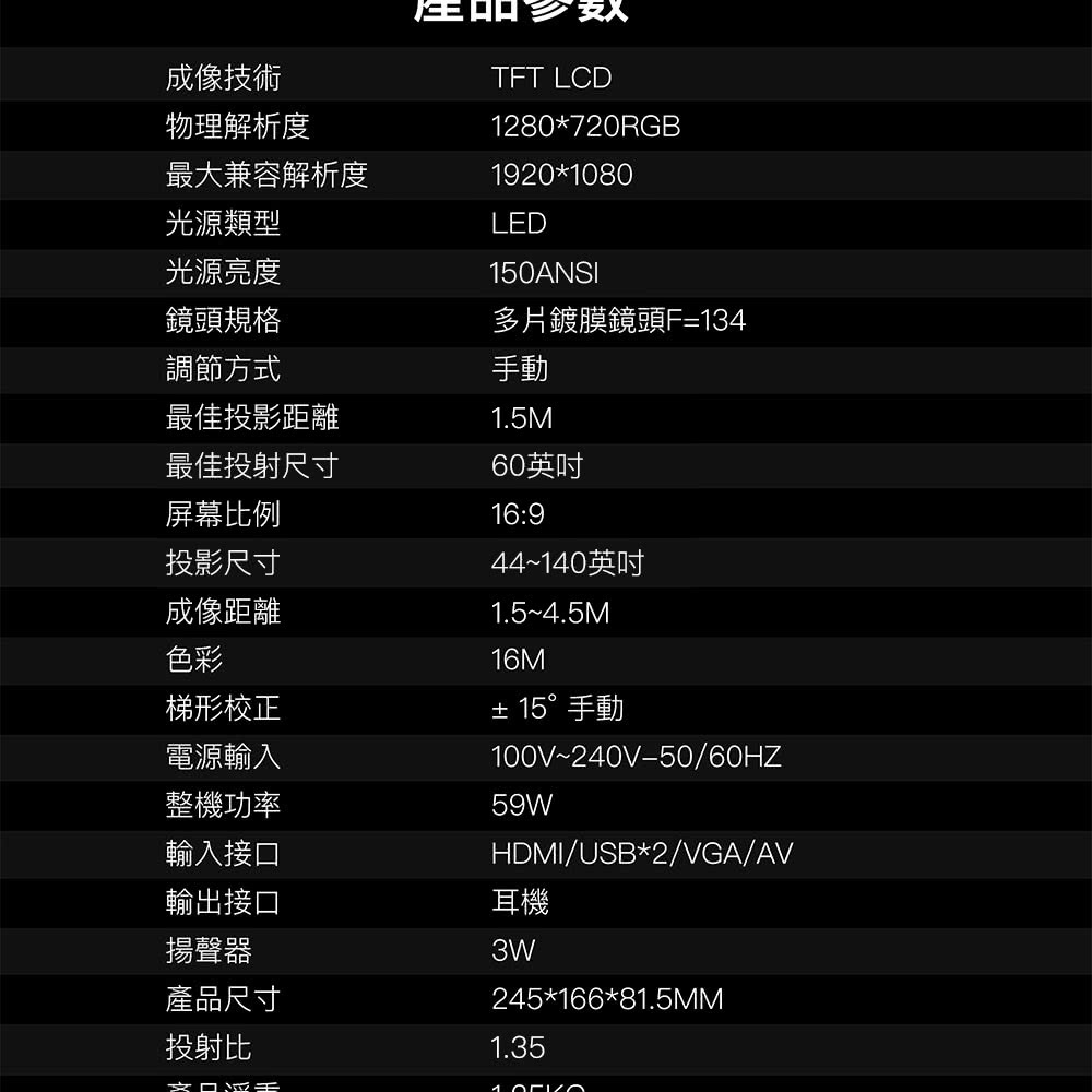 * 產品配件:遙控器x1、電源線x1、AV端子線x1、說明書x1、磨砂袋與防撞泡棉等包材