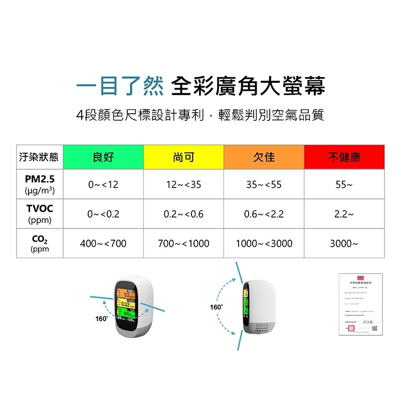 ✬全彩廣角大螢幕、4段顏色尺標設計專利,輕鬆判別空氣品質