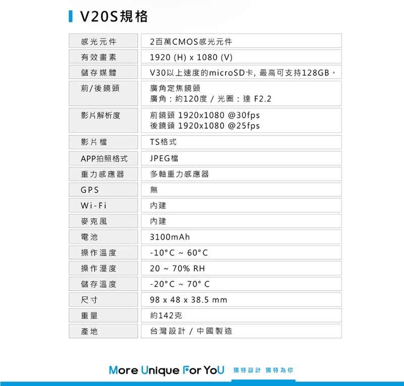 儲存媒體:V30以上速度的microsD卡,最高可支持128GB。