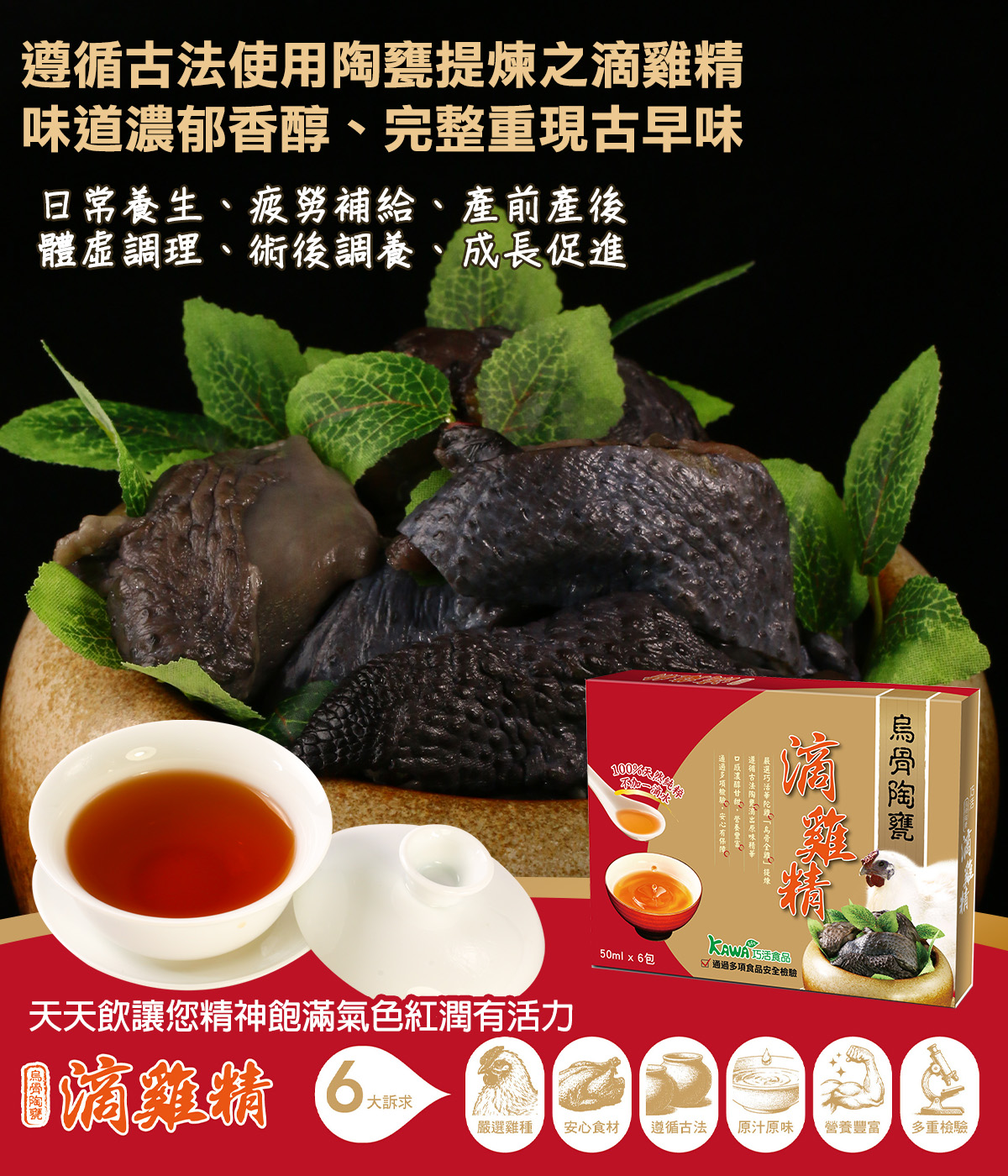 遵循古法使用陶甕提煉之滴雞精,味道濃郁香醇、完整重現古早味