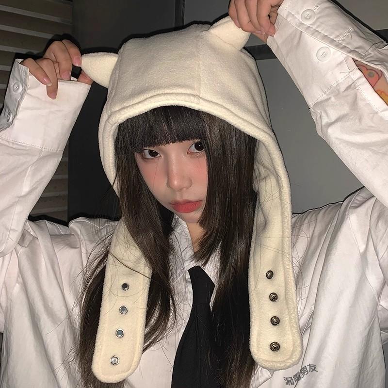 全新台灣現貨 米白色小惡魔帽子搞怪貓咪耳朵雷鋒帽亞比紐扣套頭帽