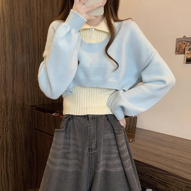 全新台灣現貨 法式慵懶 翻領無袖針織背心+水藍色外搭短版罩衫 兩件套