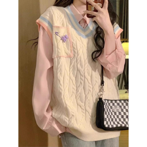 全新台灣現貨 學院風針織背心馬甲毛衣 寬鬆日系疊穿襯衫兩件套