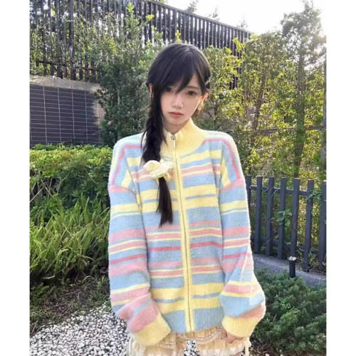 全新台灣現貨 多巴胺條紋彩虹開襟毛衣外套 馬卡龍慵懶色系