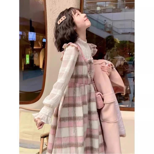 全新台灣現貨 法式溫柔奶甜格紋小飛袖背帶連身裙 學院風小個子氣質背心洋裝