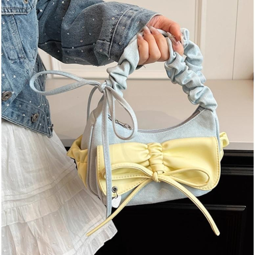 全新台灣現貨 夏天水藍色牛仔布蝴蝶结腋下包包 撞色小眾單肩斜挎包 微瑕