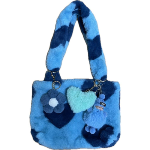 全新台灣現貨 毛絨包包 愛心拼接毛毛包 附可愛掛飾 手提單肩包 托特包