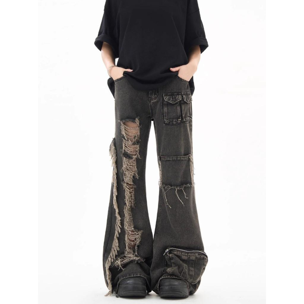 全新 美式復古破洞多口袋工裝牛仔褲 破壞感寬鬆直筒闊腿褲潮 男女皆可 尺寸大約:腰寬35 全長100 (公分)