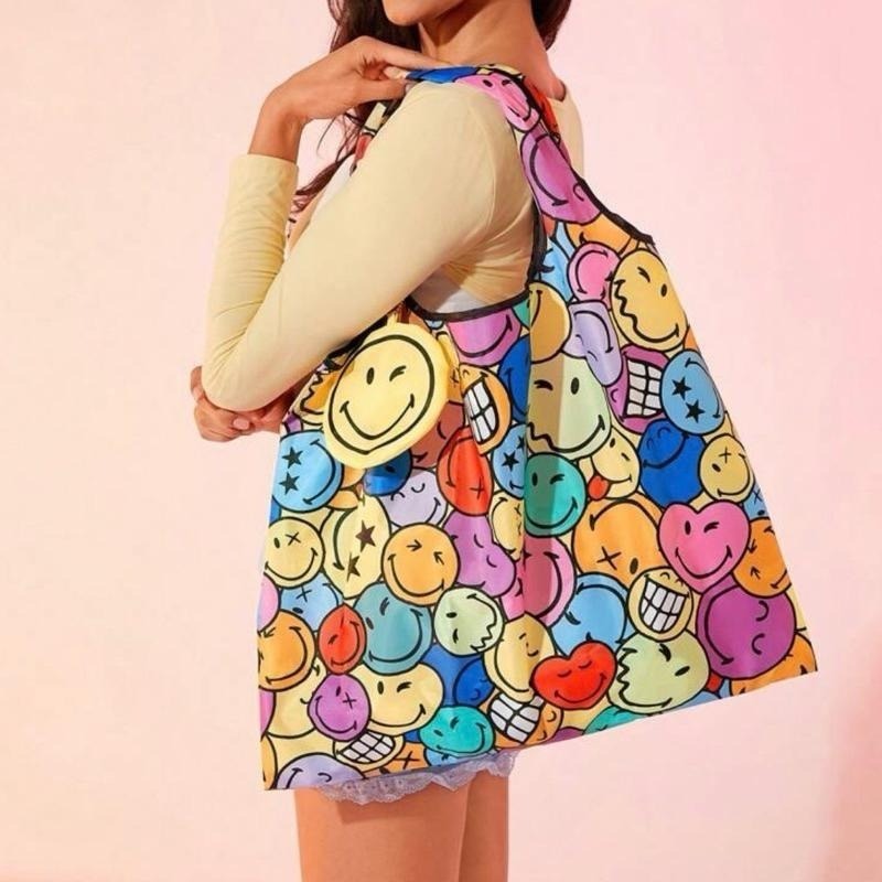 正版聯名 SmileyWorld®卡通笑臉圖案彩色購物袋 可折疊可重複使用手提購物袋
