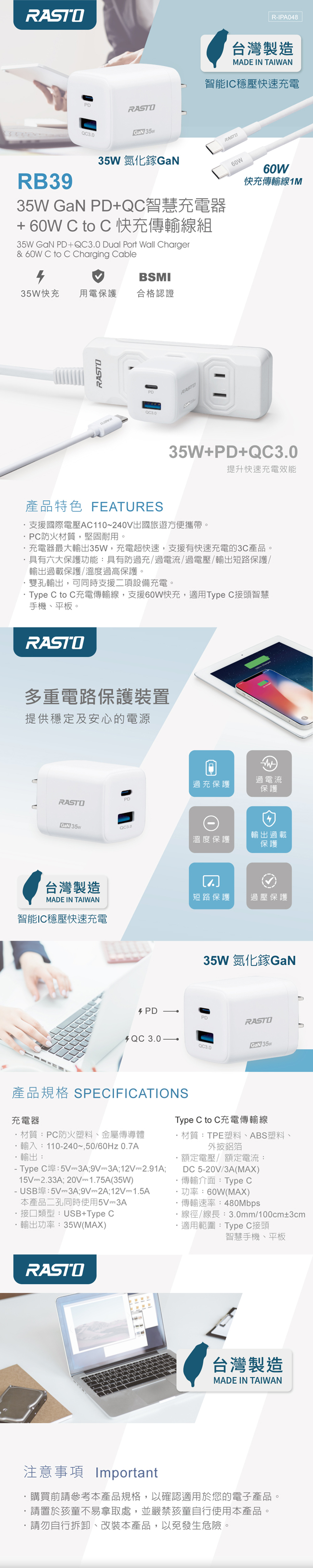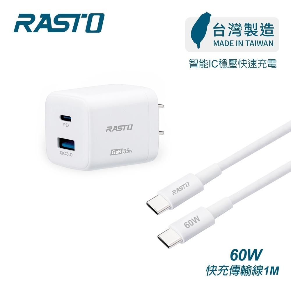 【台灣製造】RASTO RB39 35W GaN PD+QC智慧充電器+ 60W C to C 快充傳輸線組