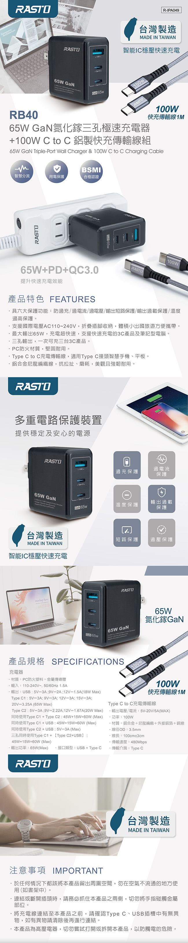 【台灣製造】RASTO RB40 65W GaN氮化鎵三孔極速充電器 + 100W C to C 鋁製快充傳輸線組