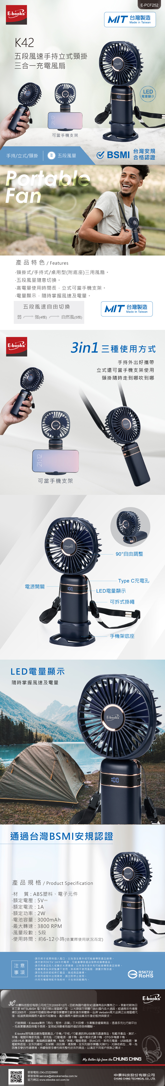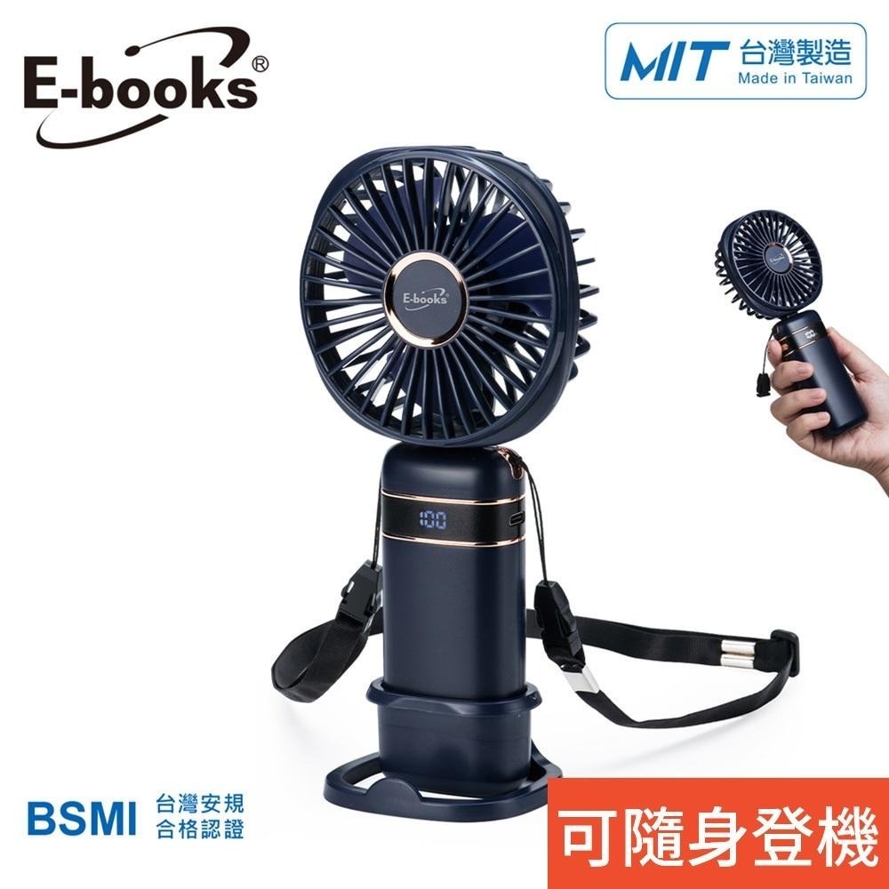 【台灣製造】E-books K42 五段風速手持立式頸掛三合一充電風扇 (使用鋰電池可隨身登機)