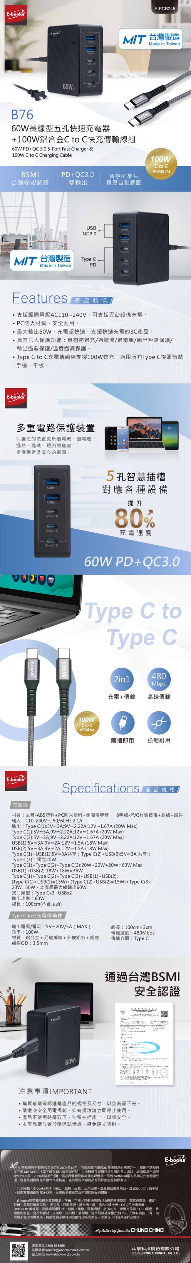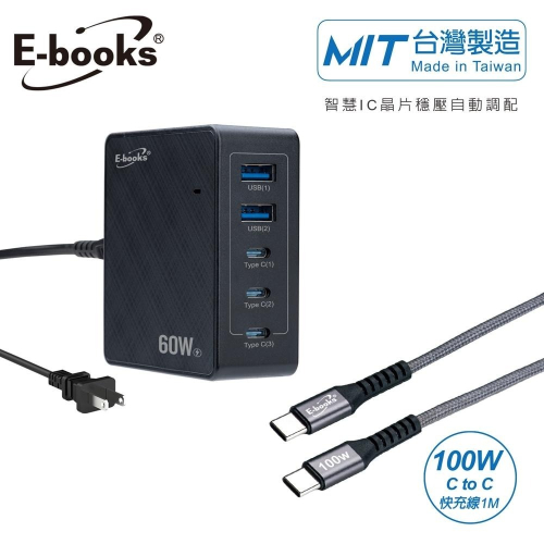 【台灣製造】E-books B76 60W長線型五孔快速充電器+100W 鋁合金C to C快充傳輸線組