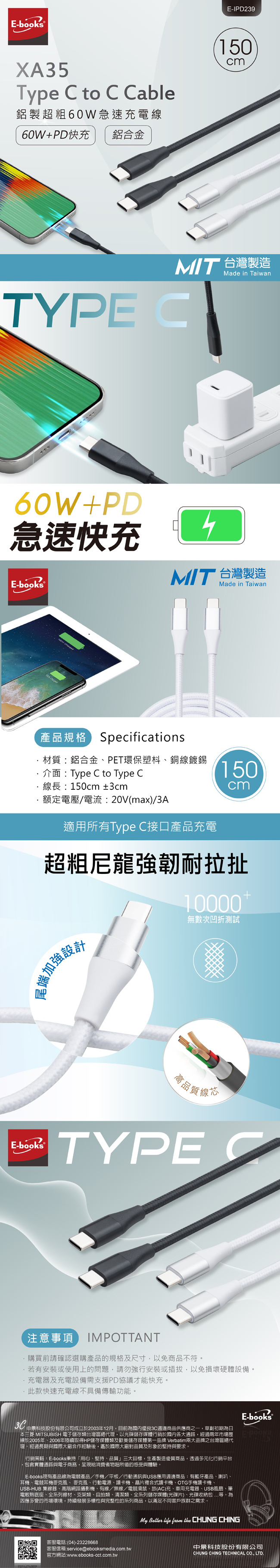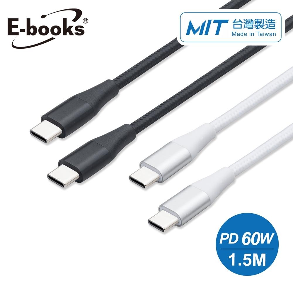【台灣製造】E-books XA35 Type C to C 鋁製超粗60W急速充電線1.5M