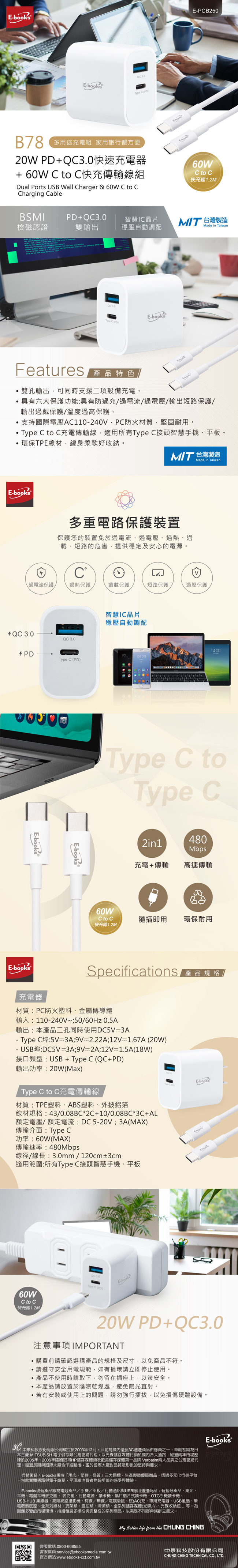 【台灣製造】E-books B78 20W PD+QC3.0快速充電器 + 60W C to C快充傳輸線組