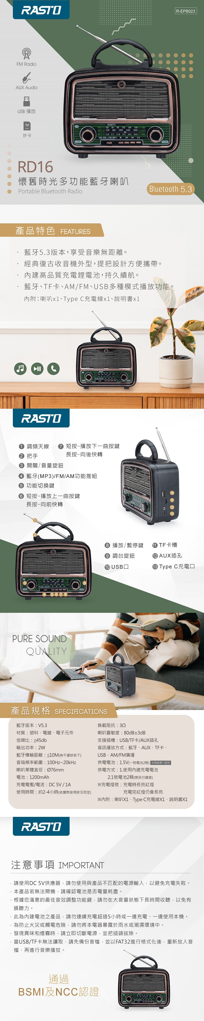 商品說明: .識別碼:R53771,檢磁型號:R-EPB023 .NCC號碼:CCAH24LP0280T6 .藍牙5.3版本,享受音樂無距離 .經典復古收音機外型,提把設計方便攜帶 .內建高品質充電鋰電池,持久續航 .藍牙、TF卡、AM/FM、USB多種模式播放功能 商品規格: .藍牙版本:V5.3 .材質:塑料、電鍍、電子元件 .信噪比:≧45db .輸出功率:2W .藍牙傳輸距離:≦10M(無干擾狀態下) .音箱頻率範圍:100Hz~20kHz .喇叭單體直徑:Ø76mm .電池:1200mAh .充電電壓/電流:DC 5V / 1A .使用時間:約2-4小時(依實際使用狀況而定) .負載阻抗:3Ω .喇叭靈敏度:80dB±3dB .支援插槽:USB/TF卡/AUX插孔 .音訊播放方式:藍牙、AUX、TF卡、USB、AM/FM廣播 .供電電池:1.5V(一號電池2顆) .供電方式:1.使用內建充電電池 2.1號電池2顆(需另行購買) ※兩者擇一使用 ※充電燈號:充電時長亮紅燈,充電完紅燈仍會長亮 ※內附:喇叭X1、Type C充電線X1、說明書X1 .商品尺寸:21*9.3*18cm .產品重量:707g .產地:中國 .貨源:公司貨 .保固說明:依商品送達日起保固6個月