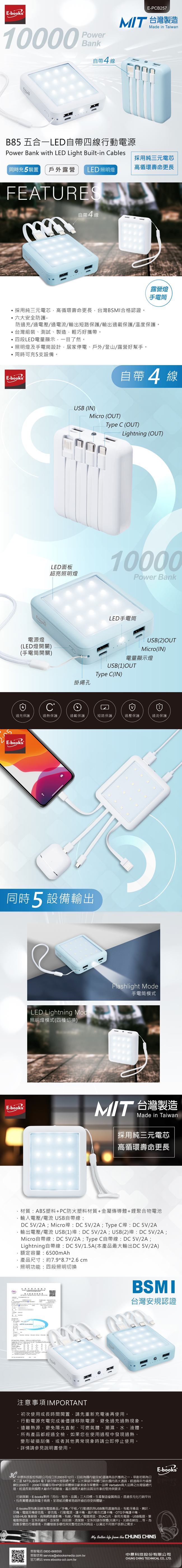 【台灣製造】E-books B85 五合一LED自帶四線行動電源