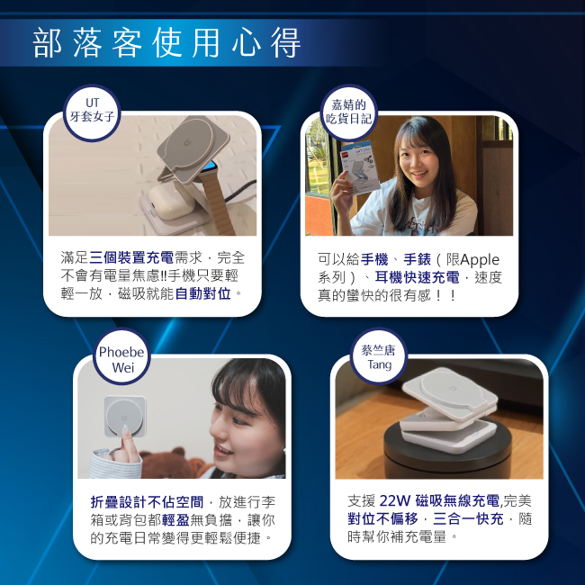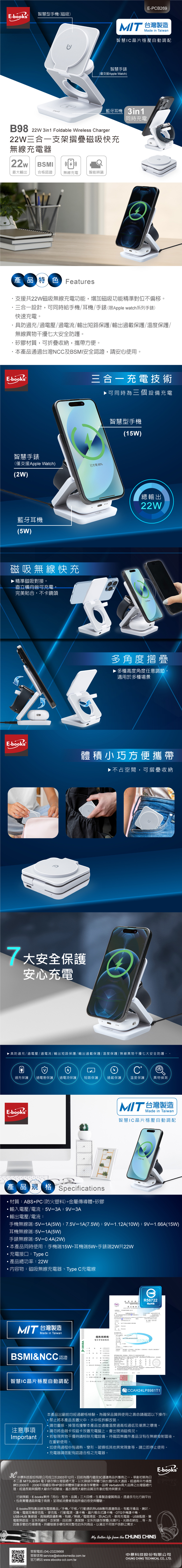 商品說明: .BSMI證號:R56722,檢磁型號:WC-002 .NCC字號:CCAH24LP8981T1 .支援共22W磁吸無線充電功能,增加磁吸功能精準對位不偏移 .三合一設計,可同時給手機/耳機/手錶(限Apple watch系列手錶)快速充電 .具防過充/過電壓/過電流/輸出短路保護/輸出過載保護/溫度保護/無線異物干擾七大安全防護 .可折疊收納,攜帶方便 .本產品通過台灣NCC及BSMI安全認證,請安心使用 商品規格: .材質:ABS+PC(防火塑料)+金屬傳導體+矽膠 .輸入電壓/電流:5V⎓3A;9V⎓3A .輸出電壓/電流: 手機無線端:5V⎓1A(5W);7.5V⎓1A(7.5W);9V⎓1.12A(10W);9V⎓1.66A(15W) 耳機無線端:5V⎓1A(5W) 手錶無線端:5V⎓0.4A(2W) .本產品同時使用:手機端15W+耳機端5W+手錶端2W共22W .充電接口:Type C .產品總功率:22W .內容物:磁吸無線充電器、Type C充電線、說明書 .商品尺寸:14.3*10*4cm .產品重量:164g .產地:中國 .貨源:公司貨 .保固說明:依商品送達日起保固6個月
