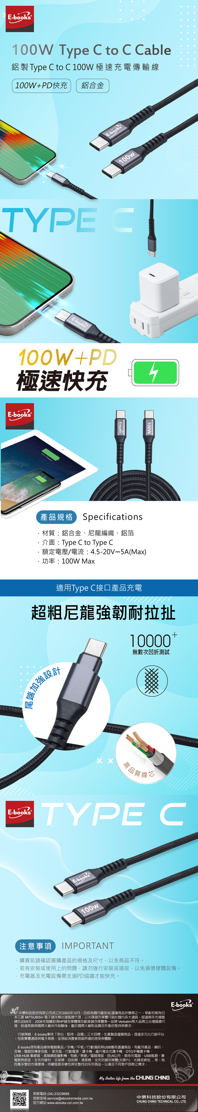 商品說明: .100W大功率,支援PD快充,充電速度提升90% .5A大電流,充電快速,支援資料傳輸 .尾端加強設計耐拉扯 .支援熱插拔,鋁合金材質 商品規格: .材質:鋁合金、尼龍編織、鋁箔 .介面:Type C to Type C .線長:100cm±3cm .額定電壓/電流:4.5-20V⎓5A(Max) .功率:100W Max .商品尺寸:16x8x3cm .產品重量:19g .產地:中國 .貨源:公司貨 .保固說明:依商品送達日起保固6個月