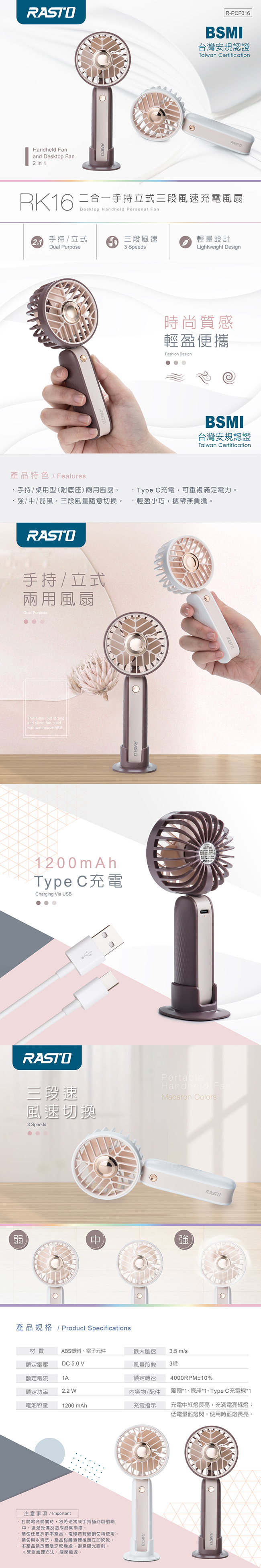 商品說明: .BSMI識別碼:R53771,檢磁型號:R-PCF016 .手持/桌用型(附底座)兩用風扇 .強/中/弱風,三段風量隨意切換 .Type C充電,可重複滿足電力 .輕盈小巧,攜帶無負擔 商品規格: .材質:ABS塑料+電子元件 .額定電壓/電流:5V/1A .額定功率:2.2W .電池容量:1200mAh .最大風速:3.5m/s .風量段數:3段 .額定轉速:4000RPM±10% .內容物/配件:風扇*1、底座*1、Type C充電線*1 .充電指示:充電中紅燈長亮,充滿電亮綠燈;低電量藍燈閃;使用時藍燈長亮 .商品尺寸:6.8*16.8*6.8cm .產品重量:134g .產地:中國 .貨源:公司貨 .保固說明:依商品送達日起保固6個月