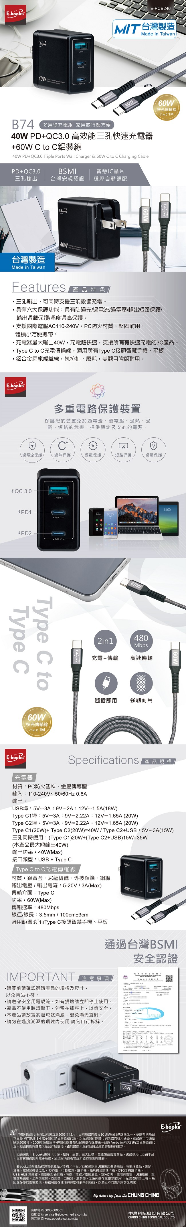 台灣製造 B74 40W PD+QC3.0 高效能三孔快速充電器+60W C to C