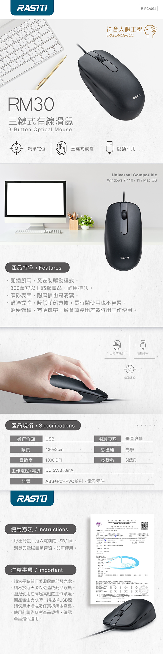 RASTO RM30 三鍵式有線滑鼠
