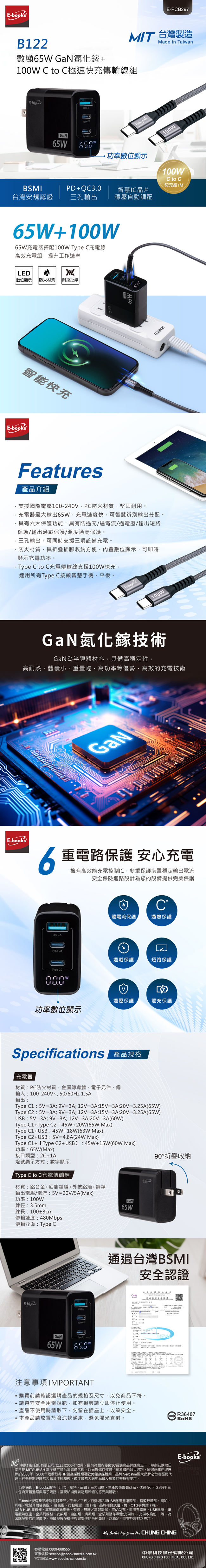 E-books B122 【台灣製造】數顯65W GaN氮化鎵+100W C to C極速快充傳輸線組