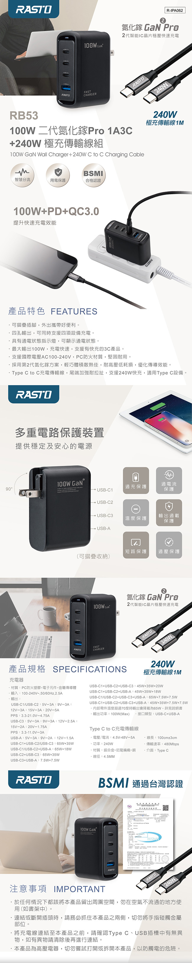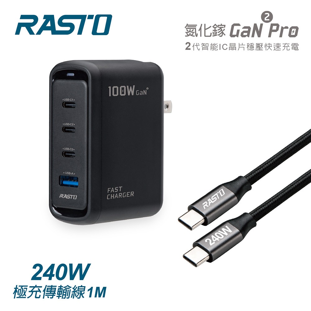 RASTO RB53 100W 二代氮化鎵Pro 1A3C +240W 極充傳輸線組
