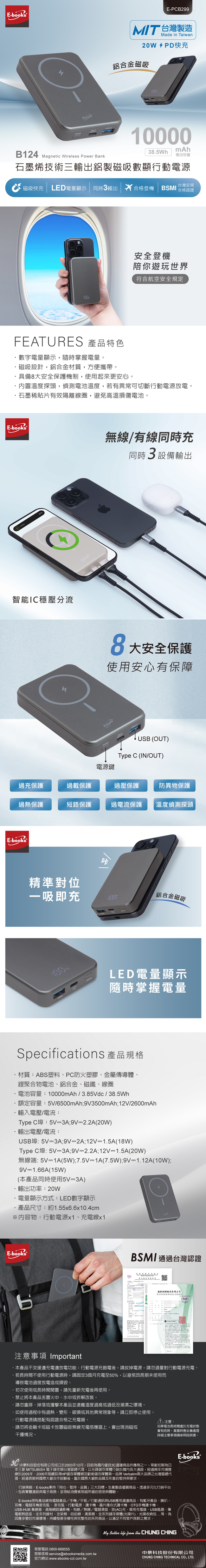 產品重量:190g 包裝重量:233g 商品尺寸:10x6.4x1.5cm 包裝尺寸:16.7x9.6x3.2cm 產地:台灣 ■產品規格 .材質:ABS塑料、PC防火塑膠、金屬傳導體、鋰聚合物電池、鋁合金、磁鐵、線圈 .電池容量:10000mAh / 3.85Vdc / 38.5Wh .額定容量:5V/6500mAh;9V3500mAh;12V/2600mAh .輸入電壓/電流:Type C埠:5V⎓3A;9V⎓2.2A(20W) .輸出電壓/電流:USB埠: 5V⎓3A;9V⎓2A;12V⎓1.5A(18W) Type C埠: 5V⎓3A;9V⎓2.2A;12V⎓1.5A(20W) .無線端: 5V⎓1A(5W);7.5V⎓1A(7.5W);9V⎓1.12A(10W);9V⎓1.66A(15W)(本產品同時使用5V⎓3A) .輸出功率:20W .電量顯示方式:LED數字顯示 ※內容物:行動電源x1、充電線x1