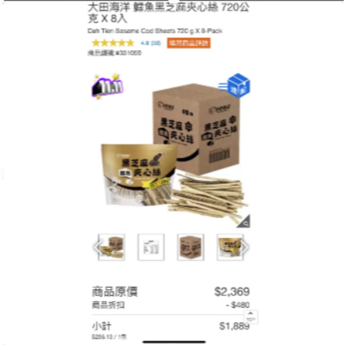 這次購買明細如下 1.大田黑芝麻夾心絲 2包 214*2=428元 2.包材 5元 3.7-11運費 38元 合計:471元(貨到付款)