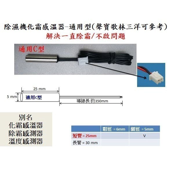 通用C型 除濕機化霜感溫器 管徑5*管長25mm 導線長 350mm 連接器 無扣