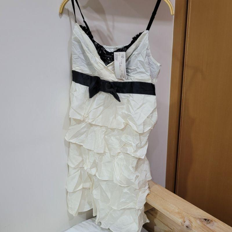 全新u're白色蝴蝶結緞面無袖露肩蕾絲蛋糕裙高腰洋裝M號