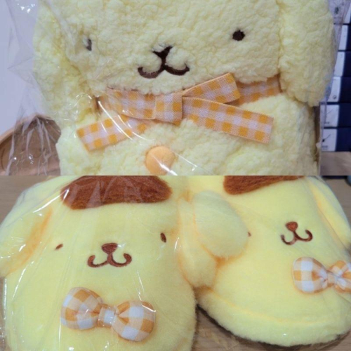 #絕版#Sanrio#布丁狗#黃色#小毛毯#披肩#娃娃#拖鞋#室內#拖#托#造型#鞋 全新百貨購入 1.絕版Sanrio 布丁狗黃色小毛毯可作披肩可收起像娃娃,打開約110*70cm,收起來約22*26*14cm 2.拖鞋