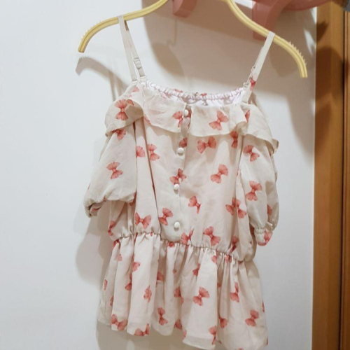 #粉#色#少女風#蝴蝶#結#小可愛#高腰#短版#上衣#露肩#短袖 高腰短版有袖可隱藏部分手臂,肩寬38胸寬40衣長46cm