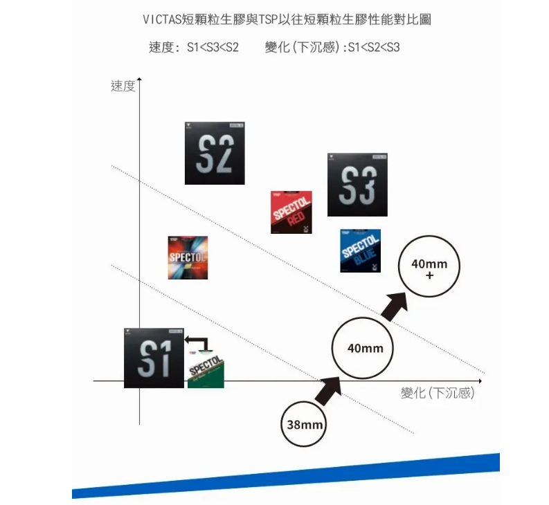 VICTAS S1:繼承了SPECTOL出色的變化,顆粒是圓柱+梯形縱向排列,具有旋轉變化和擊球速度快,適合近台快攻。