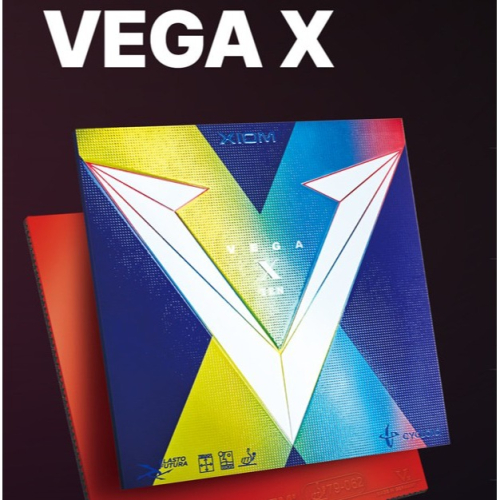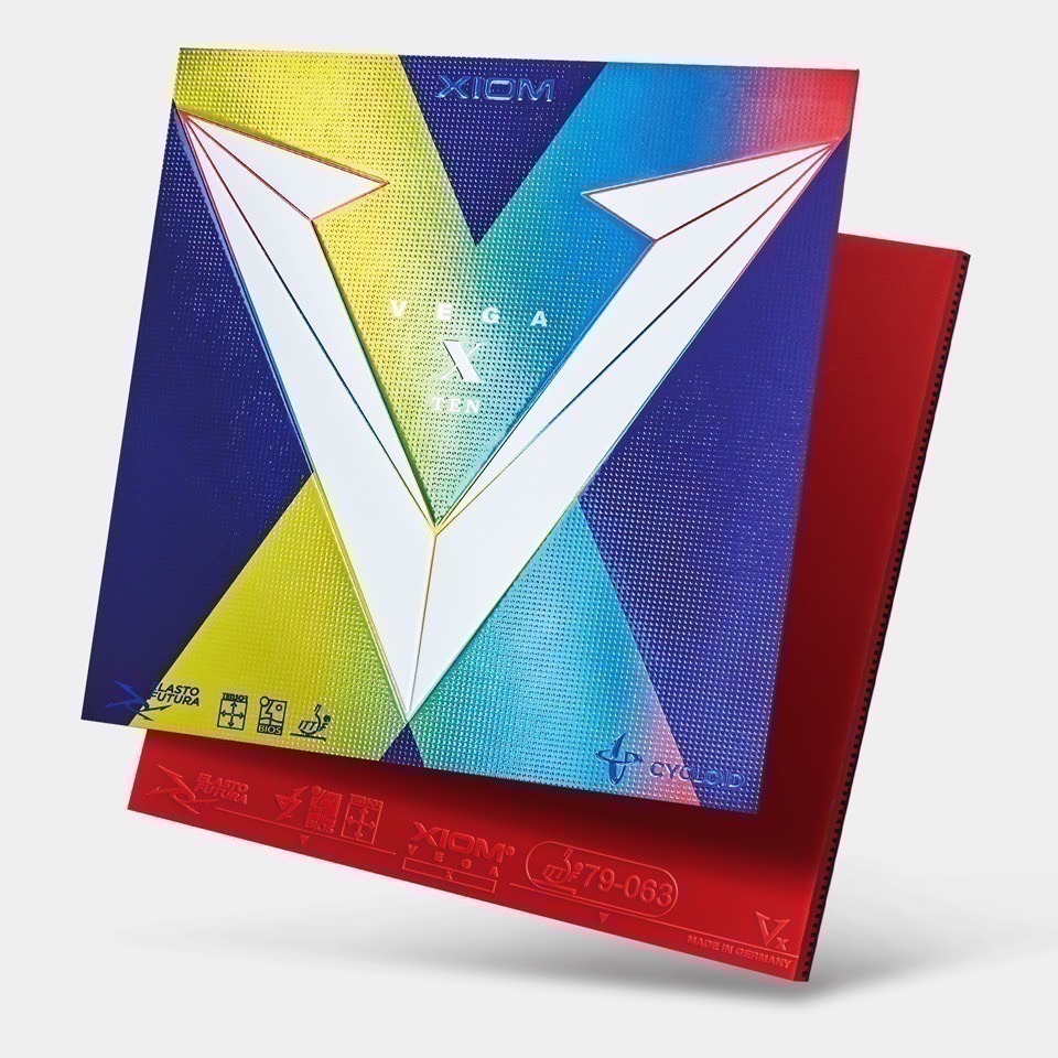 借助Xiom Vega X(Vega Ten),Xiom在競爭激烈的內能膠皮市場上樹立了典範。球員可以獲得現代的高性能上旋(modern topspin) 膠皮,且結合旋轉定向 (spin-oriented),尤其是Xiom Vega Pro的繼承者,其高動態和穩定的彈射 (海綿硬-中硬47,5° EUR),更加持球,這個更適合外置纖維板。即使放在任何球拍上,清晰的擊球感也會牢固地傳遞到您的手上。