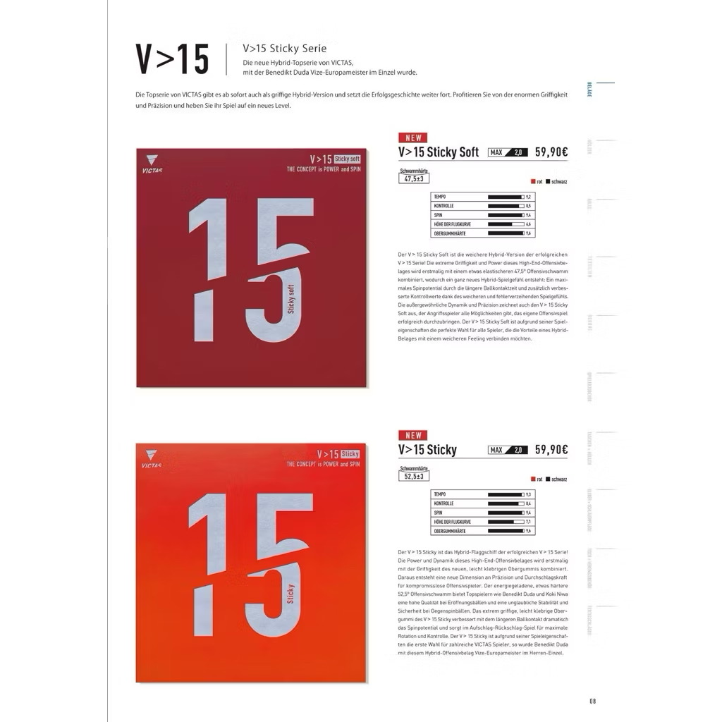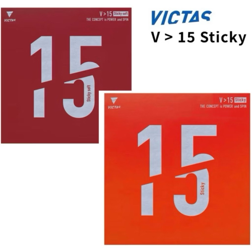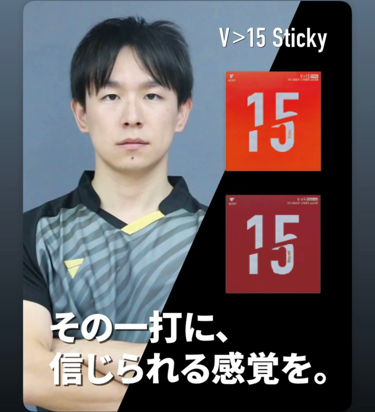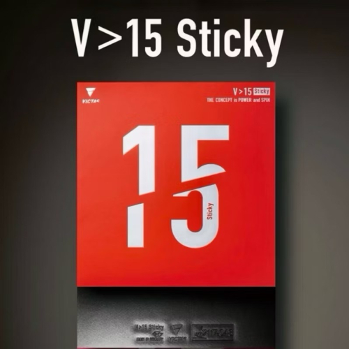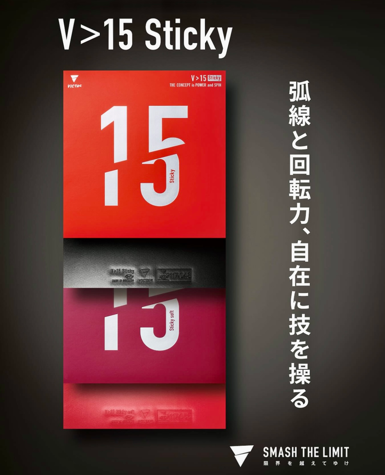體現了微粘性特徵的膠皮,和較硬且高彈性的海綿巧妙的結合, 實現了更強的旋轉力和攻擊力的完美平衡。與以前的15 不同,通過微粘性的膠皮,弧圈進攻,台內技術,快帶都能靈活的應對。『V>15 Sticky』無論進攻或是防守都能發揮出更高的水準。