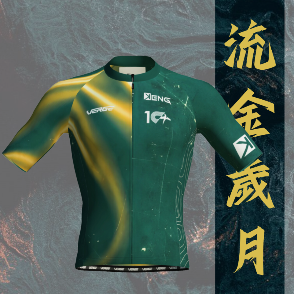 「流金歲月」透過等高線圖象徵每一次山徑的突破、十年高低起伏中的累積,金黃色渲染於綠色大底,象徵永續與文化傳遞的同時存在,實務上也藉由車衣採用100%的永續面料實踐!