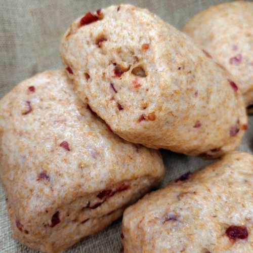 成份:純麥粉、新鮮酵母、蔓越莓乾、水 重量:單顆110g (+-5g) 保存方式:冷凍二個月