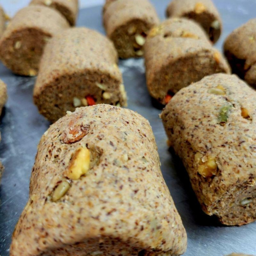 成份:全麥粉.黃金亞麻仁籽粉.新鮮酵母.水 堅果:南瓜子.葵瓜子.核桃.杏仁果.腰果,枸杞.葡萄乾