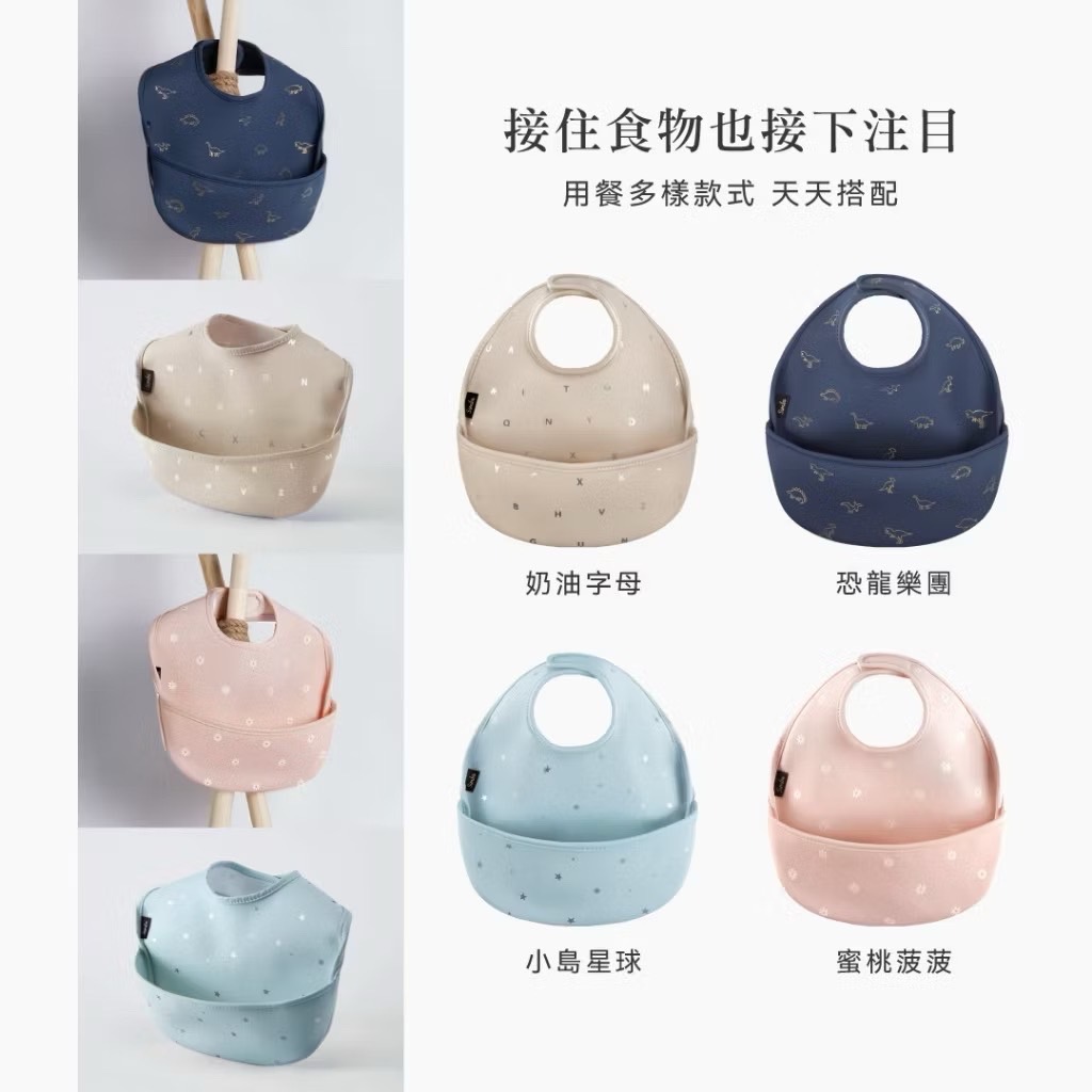 使用方式:如需使用口袋接落食,請將袋口翻至圍兜正面,並依寶寶脖圍調整魔鬼氈鬆緊度。